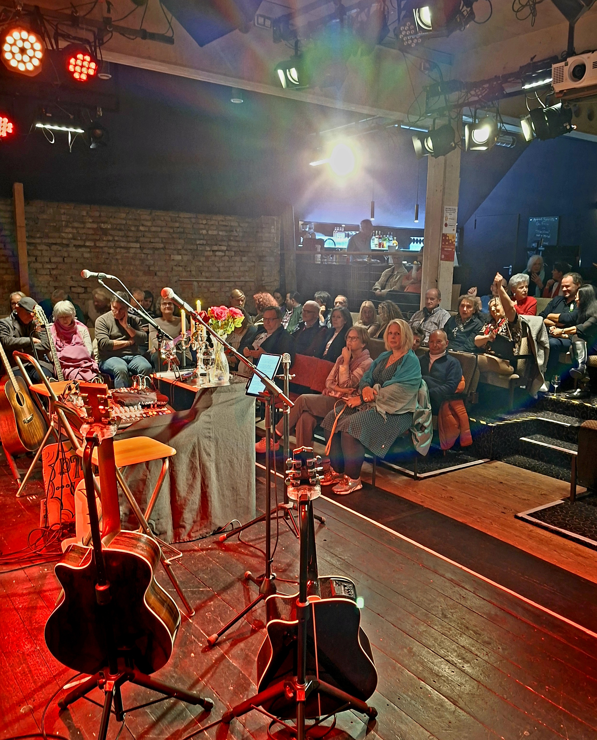 Ein schlichter Tisch mit Rosen und einem Kerzenleuchter, zwei Stühle, ein paar Gitarren, mehr braucht es kaum für einen Abend in gemütlicher Wohnzimmeratmosphäre, der ganz tief in die Erinnerungen und Träume führt. Der die Lachmuskeln strapaziert und der äußerst herzlich mit ihren Emotionen auf große Reise in die Urgründe ihrer Vergangenheit geht und sie vielleicht auch a bisserl in die Sehnsucht der Gegenwart entfliehen lässt.