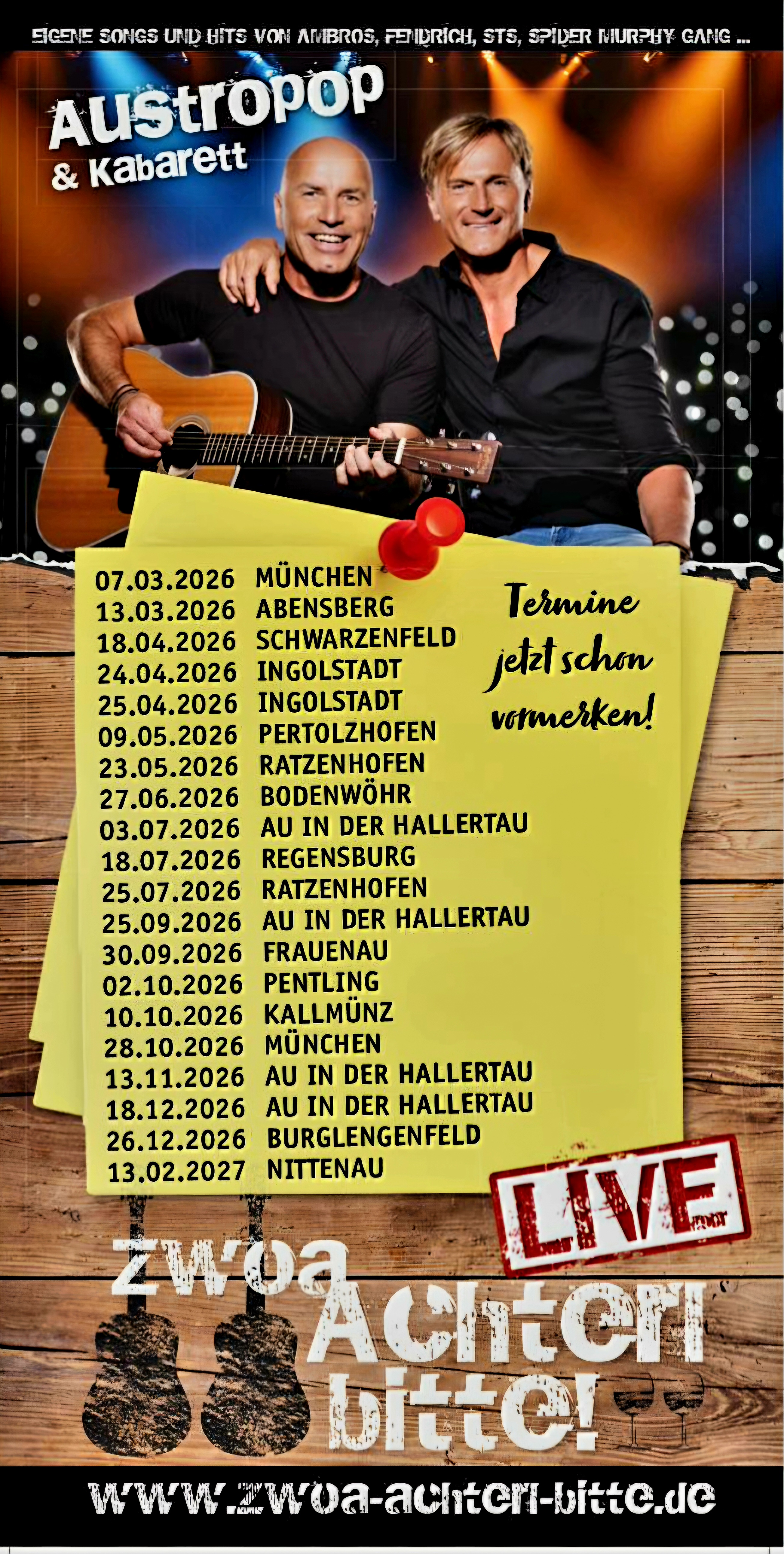 Besonders freut es uns, dass wir vor einiger Zeit Christian Prössl von der GEWEKINER ALM in NIEDERGEBRACHING kennenlernen durften, man findet sich mitten in Niederbayern in einer tollen Bergalm-Atmosphäre wieder, natürlich wie erschaffen für ein Zwoa Achter'l-bitte!-Konzert. Im Oktober 2026 werden wir dort mit unserer ÜBERDOSIS GFÜHL-TOUR Station machen, den exakten Termin geben wir demnächst bekannt. Schaut's doch einfach mal auch bei den Aktivitäten der Alm rein: www.gewekiner-alm.de