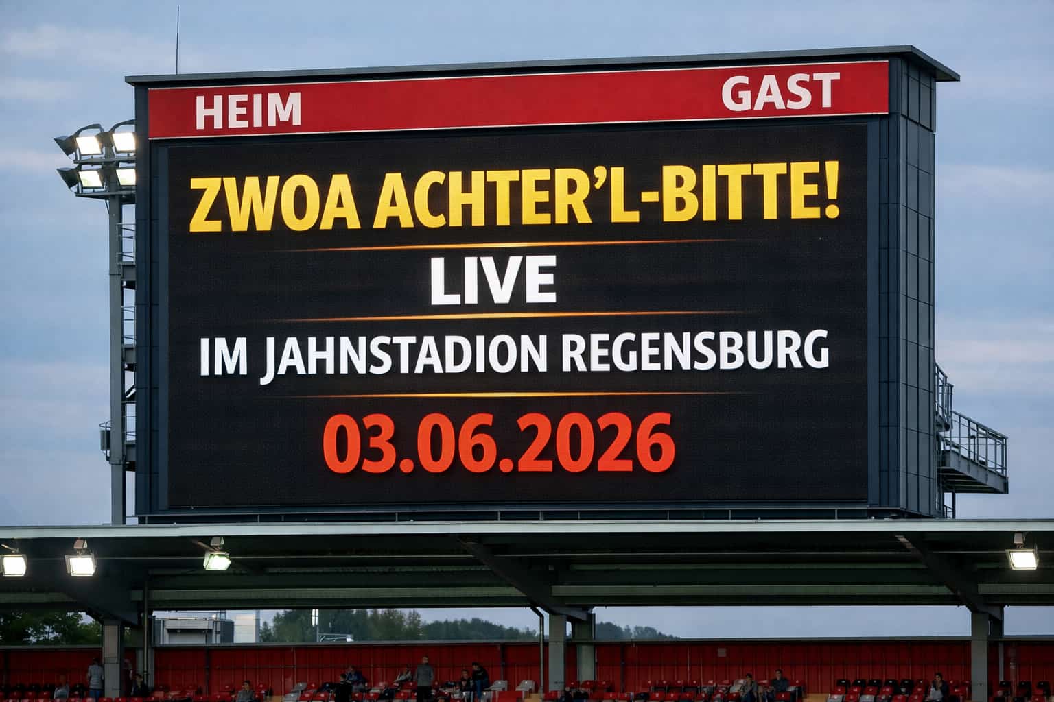 heute dürfen wir Euch ein besonderes Konzerthighlight in einer besonderen Location bekannt geben...am 03.06.2026 spielen wir im Rahmen unserer Tour "ÜBERDOSIS GFÜHL" IM JAHNSTADION REGENSBURG. Wir haben es leider nie geschafft -mit unseren sportlichen Talenten- in ein so großes Stadion zu kommen, na ja, dann nehmen wir halt unsere Gitarren in die Hände und spielen musikalisch auf. Der Ticketvorverkauf beginnt demnächst! Seid's dabei und erlebt einen tollen Abend mit uns.